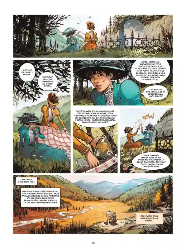 Oger zawsze w ciekawy sposób spaja swe opowiadania. Widzimy dziewczynę imieniem Betty, udającą się na rozmowę z wiekową Indianką. Jej cel jest jeden - poznać siłę i moc kobiet Dzikiego Zachodu. Każda kolejna historia coraz bardziej zagłębia ją w wielowarstwowość ich losów. Każda z innej perspektywy. Album otwiera opowieść Obietnica z rysunkami Gaelle Hersent. Pisarka Isabella Bird wyrusza do surowego wówczas Kolorado, trafiając na mężczyznę, który na zawsze odmieni jej serce. Banalny westernowy romans? Nic podobnego. Raczej tragedia dwojga osób z różnych światów, ale o podobnym rytmie serc. A to ledwie początek.