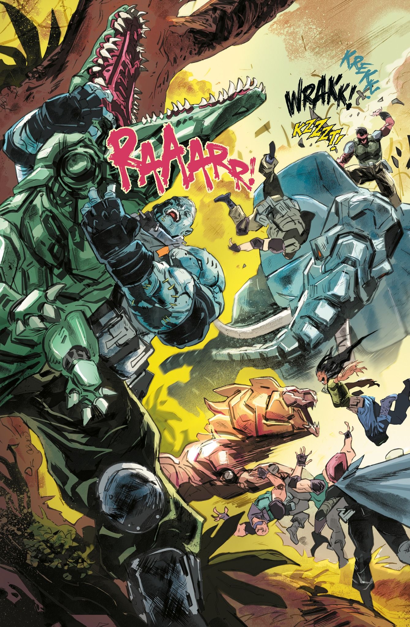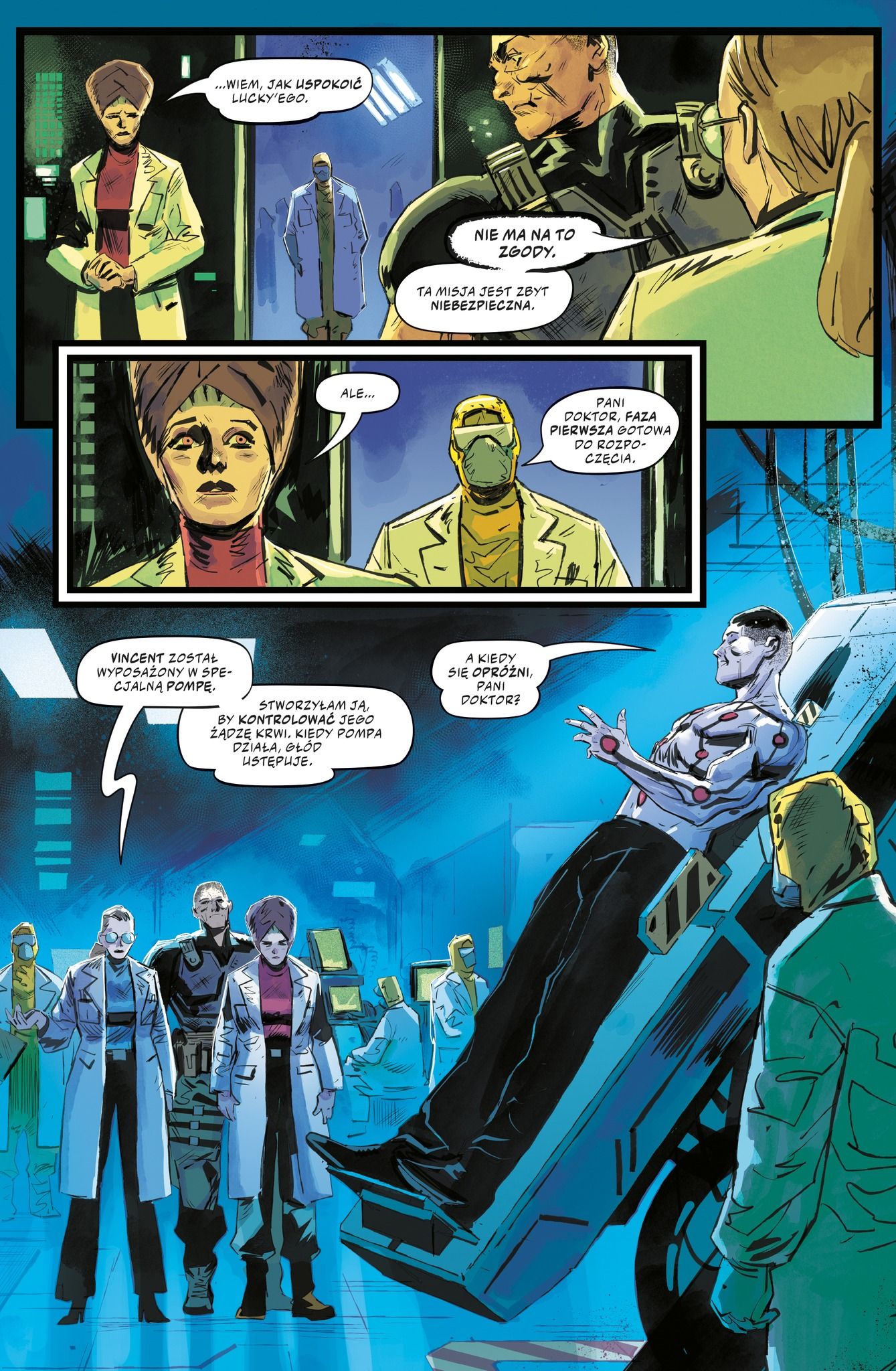 Ano stoi, tylko jest to akcja tyleż nieustanna, co miałka i bezpłciowa. Albo raczej sprawia takie wrażenie, bo rysunki Jesusa Hervasa (Cyberpunk 2077, Świat Akwilonu) są po prostu mało wyraziste. To o tyle dziwne, że jego prace z wyżej wymienionych komiksów prezentowały się lepiej. Tu są chaotyczne i nawet jeśli udało się stworzyć w miarę ciekawe projekty postaci, to całość i tak nie zapada w pamięć, bo ciągła rozpierducha zlewa się w jedno. Zresztą potworna drużyna to nawet nie pomysł Hervasa – Creature Commandos zadebiutowali w 1980 roku za sprawą J. M. DeMatteisa i Pata Brodericka. Dolary przeciwko orzechom, że oryginalną, chociaż już wiekową serią bylibyśmy bardziej zachwyceni.