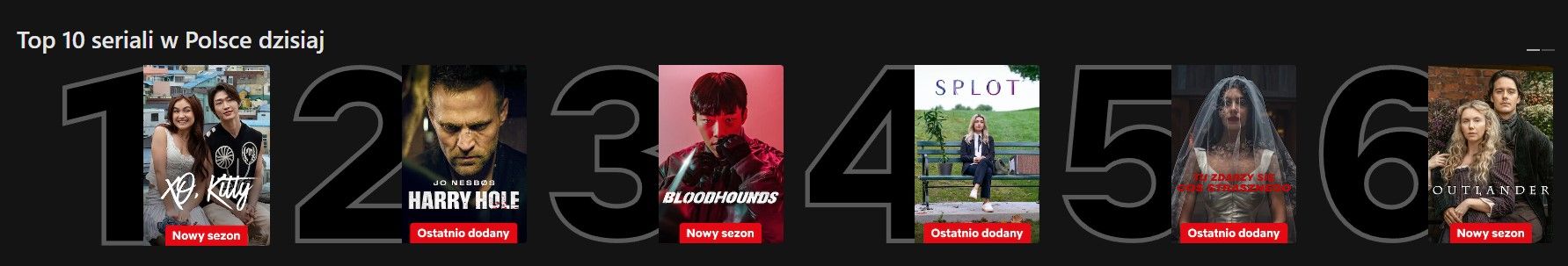 A teraz część serialowa. Harry Hole został strącony na drugą pozycję na rzecz XO, Kitty, który właśnie wchodzi w swój 3. sezon. Na ostatnim miejscu podium pojawia się Bloodhounds, z kolei Tu zdarzy się coś strasznego spadło do pierwszej piątki, jeszcze bardziej dystansując Outlandera.