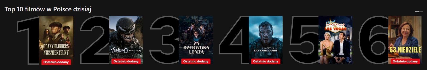 Przechodzimy do filmowej części. Wielkie zwieńczenie Peaky Blinders nadal nie do ruszenia na pierwszej pozycji, acz w pościg rusza za nim Venom 3. Podium w kolei zamyka tutaj thriller Za czerwoną linią, wyrzucając po dłuższym czasie z pierwszej trójki Maszynę do zabijania z Alanem Ritchsonem w głównej roli.