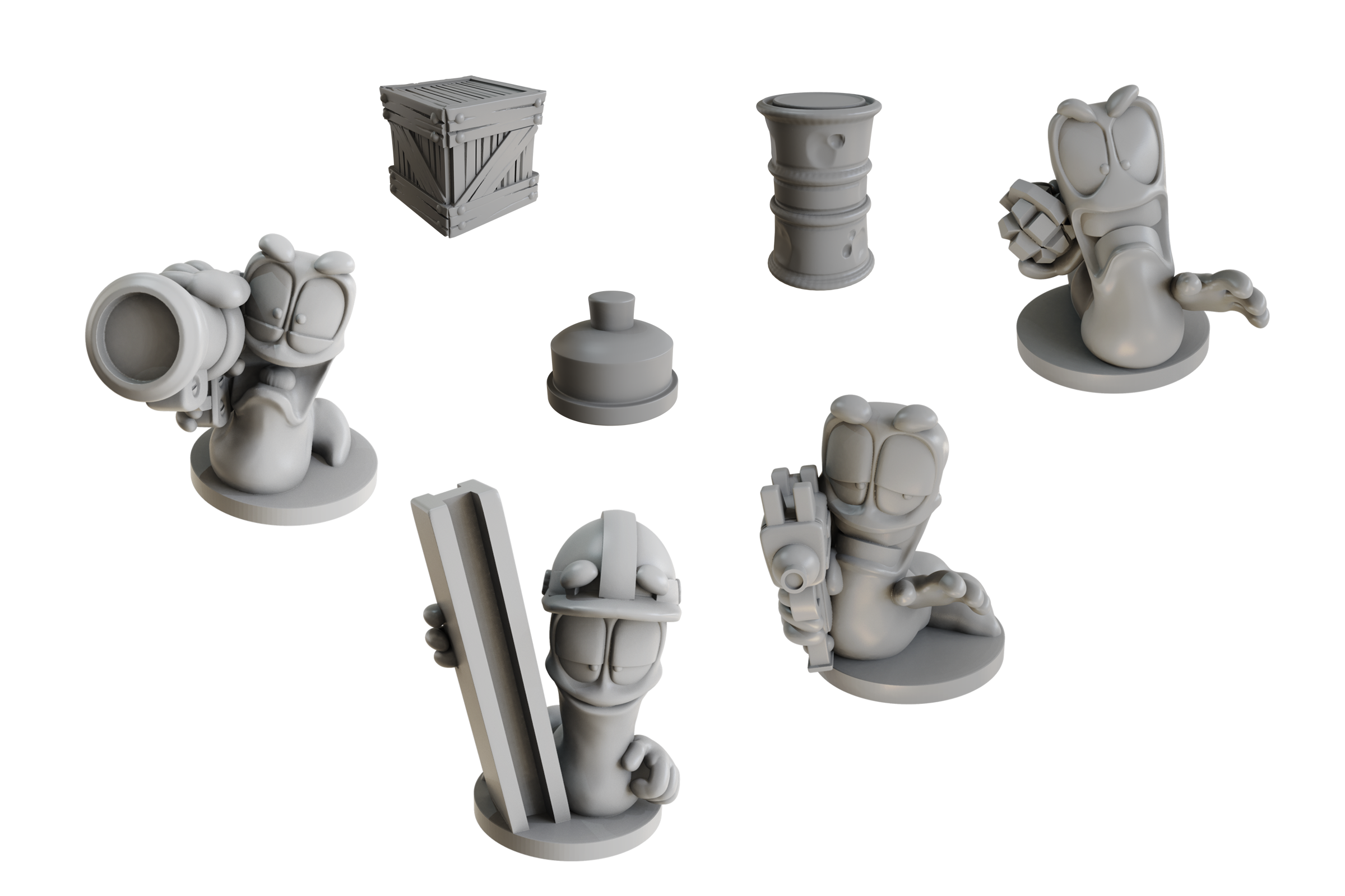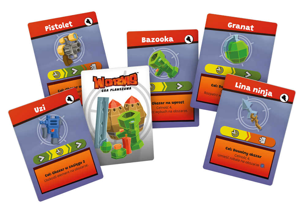 Przygotowanie do gry jest dość proste: rozkładacie kafelki mapy pamiętając o wskaźniku wiatru, który jest jednym z kluczowych elementów rozgrywki. Rozdzielacie zasoby, w tym po 4 robaczki na gracza, beczkę z ropą, minę i skrzynkę z zasobami, a następnie rozmieszczacie wszystko na planszy. Losujecie kolor drużyny, co zapobiega manipulowaniu układem na mapie, dobieracie startowy zestaw broni (uzi, bazooka, lina ninja, belka + 1 losowa karta), przygotowujecie talie zaopatrzenia i zrzutu, no i gotowe – można zabrać się za radosną rozwałkę.