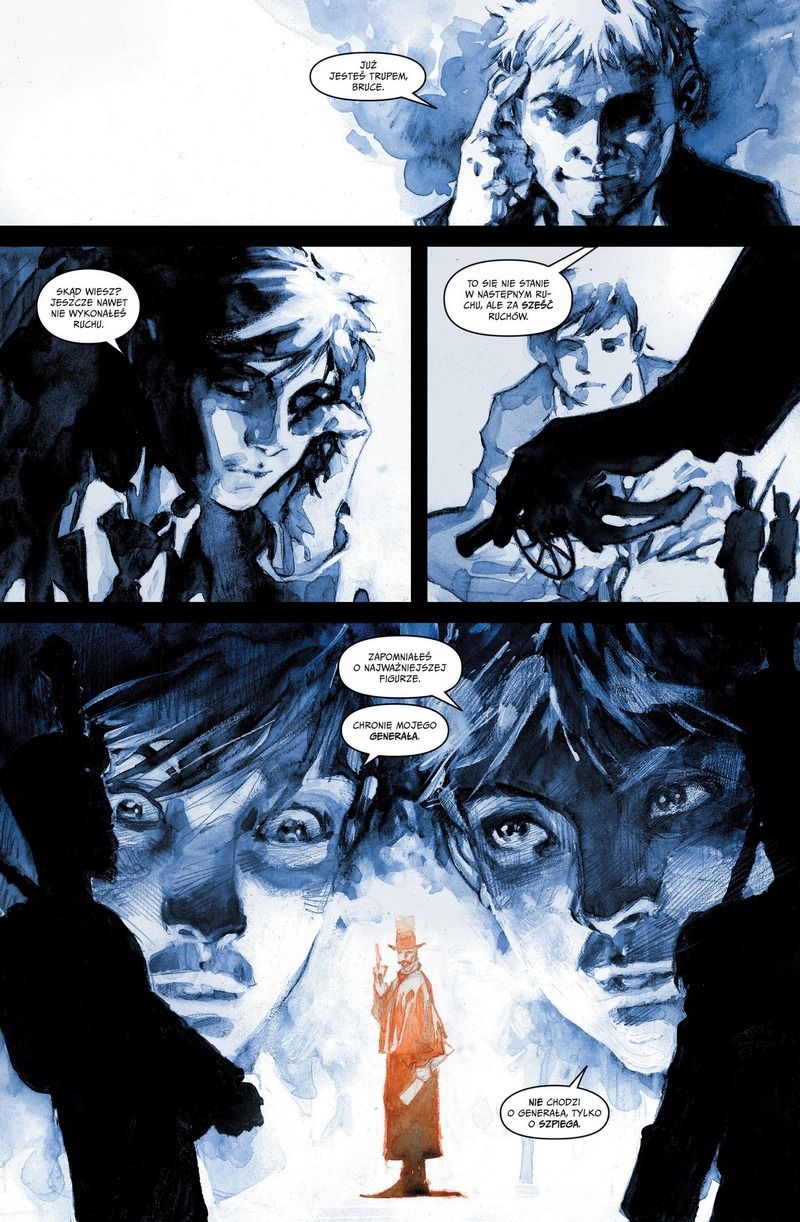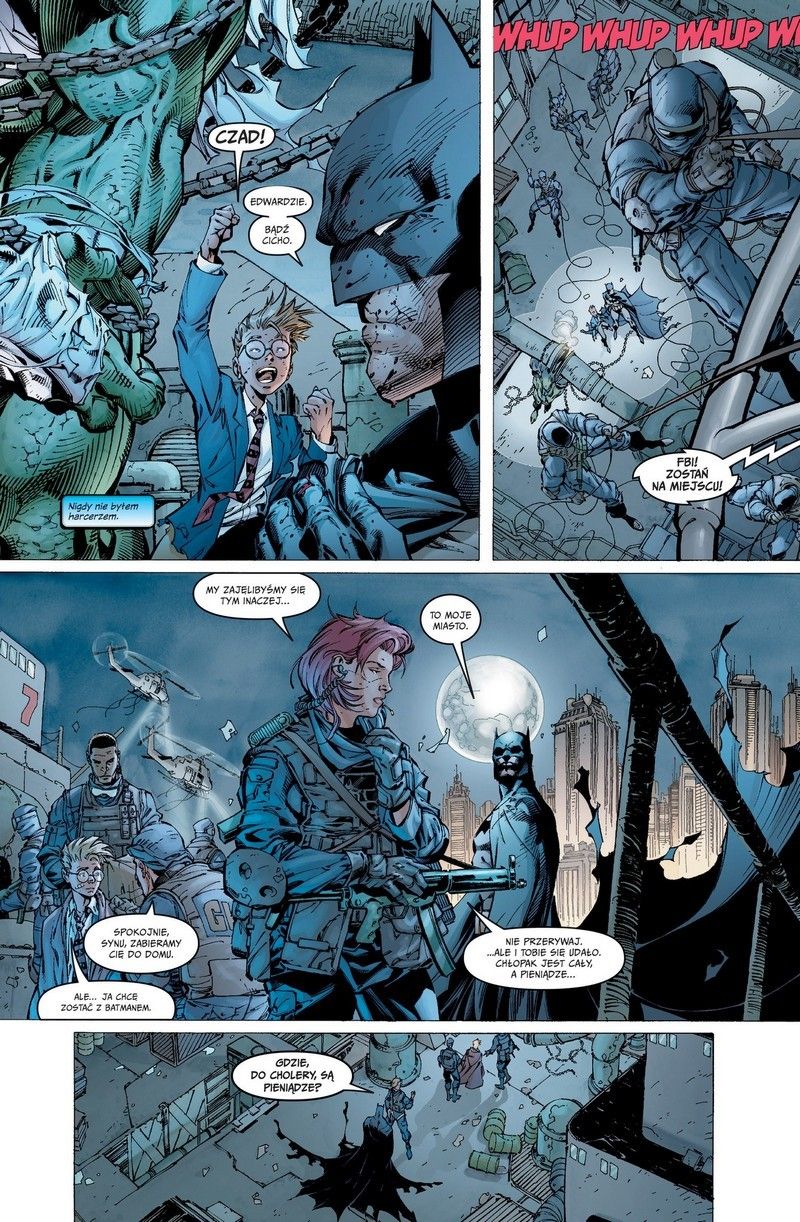 Najwybitniejsze dzieła Loeba często współtworzył Tim Sale. Jim Lee to artysta o innej wrażliwości, ale znacznie lepiej rozumiejący ducha opowieści takiej jak Hush. Jeśli kojarzycie go tylko z charakterystycznych dzieł z lat 90., tutaj będziecie mieli okazję zobaczyć, że potrafi też inaczej ukazywać peleryniarzy. Gotham to nie miejsce na muskuły, kieszonki i krzykliwe stroje. Lee jest tu niemal klasyczny. Miasto zarazem zachwyca i przeraża, a i sam Hush bliski wizualnie jest ponurym zaułkom metropolii. Rysownik jest tu łagodniejszy, ale to nie oznacza, że schował pazury. I wcale nie mam na myśli Kotki. Wystarczy spojrzeć na szaleństwo w oczach Jokera czy Scarecrowa, by poczuć dreszczyk. Jest jeszcze ktoś, kto powrócił zza grobu i może dziś jego pojawienie się nie budzi już takich emocji, ale wówczas - jak najbardziej. Tylko ktoś formatu Jima Lee mógł ponieść taki kawał fabuły bez zadyszki choćby w najmniejszym kadrze.