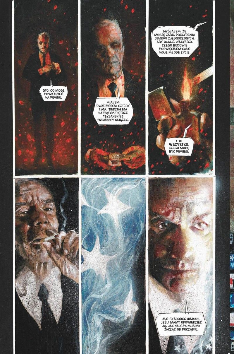 Departament prawdy tom 5: Co twój kraj może zrobić dla ciebie? to lekki przerywnik od głównego wątku potyczki z Czarnym Kapeluszem. Cofamy się do ery JFK i tego, jak Oswald stał się tym, kim jest obecnie. I nie chodzi tu wyłącznie o stanowisko szefa Departamentu... James Tynion IV stworzył jedną z najciekawszych serii komiksowych ostatnich lat i wraz z narastającym napięciem na arenie międzynarodowej, specyfiką rządów Donalda Trumpa i mnożącymi się teoriami spiskowymi, staje się ona jeszcze bardziej intrygująca. Oby nie napotkała na kolejne przerwy i następne tomy były wydawane w przyzwoitym tempie. Wierzmy w to, albowiem wiara czyni cuda, czyż nie?