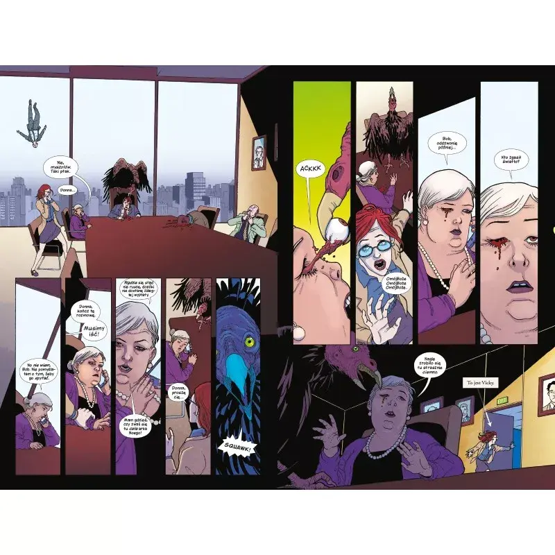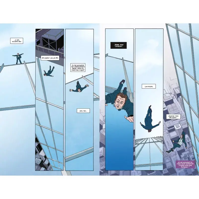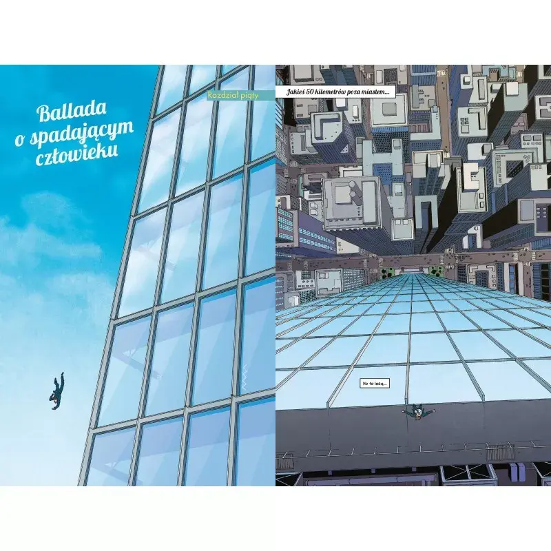 W zamian znów poznamy cztery historie, które w założeniach powinny mrozić krew w żyłach. W Balladzie o spadającym człowieku mężczyzna rzuca się z wysokiego wieżowca i lecąc ku swej zgubie podgląda co dzieje się na poszczególnych piętrach. A tam – klasyczne weird fiction: myszołów wydłubujący oczy uczestnikom korpospotkania, wyrwane flaki i odcięte głowy. Oprócz gore znajdzie się też na szczęście chwila refleksji nad ludzkim życiem. Druga opowieść bez żadnych słów pokazuje trzy różne warianty życia młodego człowieka, który kupił od naszego antybohatera Wykręcone neapolitańskie. Pomysł rewelacyjny, ale wykonanie wydało mi się nieco nieczytelne.
