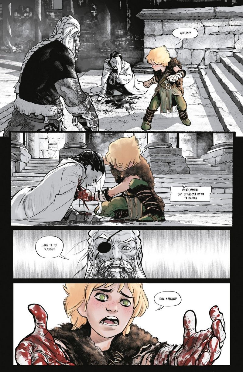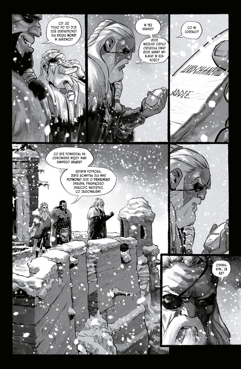 Tirso bez trudu poradziłby sobie z nordyckimi mitami, a to, jak wizualnie przetwarza wizerunek Deathstroke'a, godne jest miodu pitnego od samego Odyna. Mniej barw, więcej mroźnej surowości. A jak już mowa o kolorach. Dominuje biel, czerń i szarzyzna. To celowy zabieg wynikający z fabuły, albowiem wraz z zimą nastała, ujmijmy to, monochromatyczność barw. I tu właśnie kluczowym elementem jest małoletnia osóbka pod opieką Slade'a. Tirso momentami jest na tyle autentyczny w kreowaniu północnego chłodu, że ktoś kompletnie nieznający świata DC mógłby wziąć album za samodzielne dzieło fantasy inspirowane nordyckimi mitami. A to już o czymś świadczy.