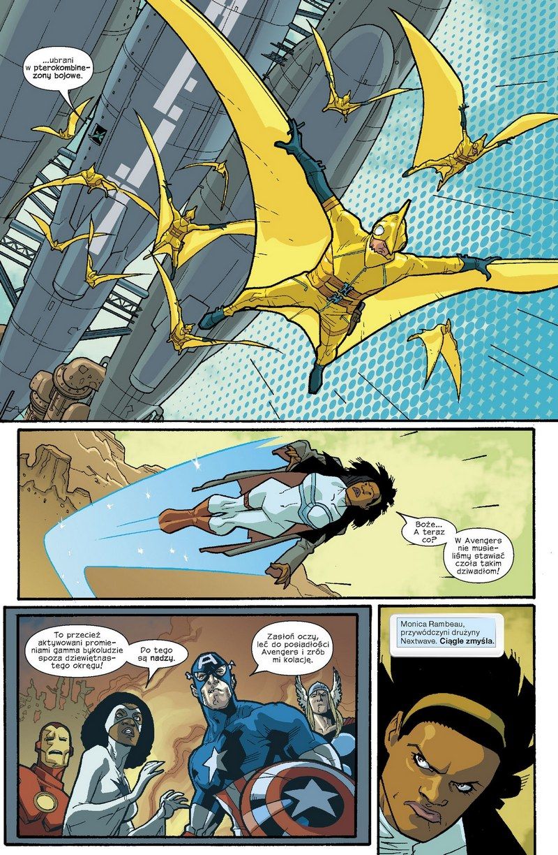 Nextwave to zbieranina różnych person z całego uniwersum Marvela. Herosi pracowali kiedyś dla agencji HEJT, jednak po zdemaskowaniu jej jako organizacji „tych złych”, postanowili wziąć ją na cel. Zwykle walka z dobrze zorganizowaną bojówką nie kończy się dobrze, ale tytułowa grupa ma zaskakująco solidny skład. Na jej czele stoi Monica Rambeau, niegdysiejsza Kapitan Marvel i przywódczyni Avengers (o czym wielokrotnie wspomina…). Ramię w ramię stoją z nią Machine Man, Boom-Boom, Elsa Bloodstone i niejaki Kapitan. Choć nie są to herosi z pierwszej ligi, potrafią przyłożyć. A to ważny argument w walce pełnej nie tylko niebezpieczeństw, ale i dziwactw.