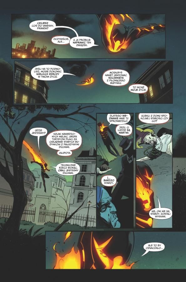 Autor jednak nie zapomina, że prowadzi serię superbohaterską. Dostajemy podwójne widowisko. W Nowym Orleanie nie dzieje się dobrze, a fakt, że Dylan jest chwilowo nieobecny, nie poprawia sytuacji. Sam bohater mierzy się w tym czasie ze swoim dziedzictwem, nie tylko rodzinnym, ale i zawodowym. Posiadaczy jego mocy było wcześniej wielu i większość, zamiast pryncypialnych porad, pragnie podarować cios toporem bądź innym narzędziem mordu. Parrott ma jednak ambicje znacznie większe niż napisanie kolejnego tytułu z peleryniarzem. I cały trzeci tom to udowadnia.