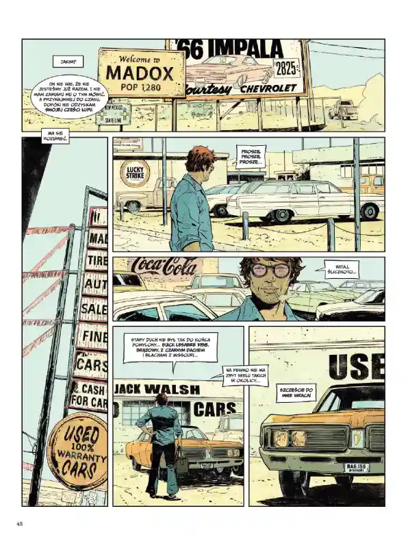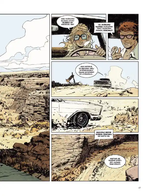 Podobnie jak w Wężu i kojocie, dostajemy tu przepiękne pustynne pejzaże w klimacie epoki krążowników szos i przydrożnych barów na środku pustkowia. Philippe Xavier potrafi grać tym wszystkim perfekcyjnie i na wszystkim można zawiesić oko. Od pustkowi, które wbrew pozorom obfitują w detale, poprzez przecudowne samochody, aż po całą infrastrukturę, zarówno architektoniczną, jak i ludzką. Co jest jednak najlepsze? Philippe potrafi opowiadać obrazem. Jego kadry są jak filmowe ujęcia i aż proszą się o solidną oprawę muzyczną. Oczywiście z adekwatnych do nich czasów.