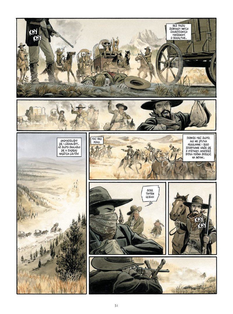Rysownicy nie stronią od przemocy, ale to poziom pomiędzy staroszkolnymi spaghetti westernami, a Tarantino. Widać więc obrażenia, ale to nie czerwona jatka. Czemu wspominam od razu o przemocy? Komiks traktuje o stróżach porządku, a ich zadanie nie polegało na wypisywaniu mandatów. Laurent Astier z jego niedoszłym zamachem na Abe'a czy Dmitri Armand i losy rangera Wernera są moimi faworytami, ale każdy artysta pokazuje tu piękną szkołę klasycznego rysunku, ukazując pełny bukiet smaków tamtej ery. Surowej, ale i charakterystycznej w całej swej rewolwerowej oprawie. To nie Dziki Zachód z makietami budynków, a realnie zilustrowana epoka.