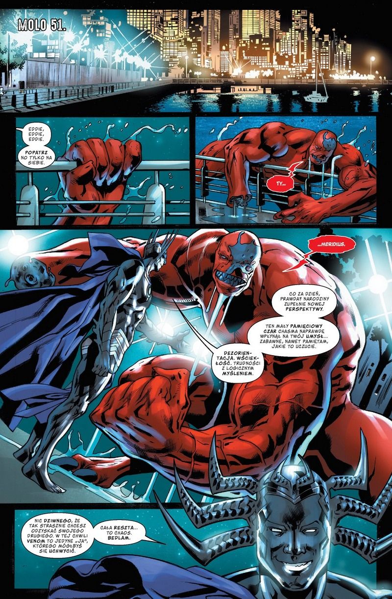 Al Ewing najwyraźniej tęskni za Nieśmiertelnym Hulkiem. Venom tom 2 wchodzi bowiem w tą szczególną mistykę, w której biblijno-apokaliptyczną aurę zastępuje kosmos i klyntarska mitologia. Używam tego słowa, bo okazuje się, że Król w Czerni[UsW1] to tytuł znacznie bardziej złożony niż wydawało się to wcześniej. I to jest ta dobra strona tego albumu. Rozwijane są wątki z przeszłości, mające szansę być wykorzystane przez innych autorów. Może Eddie nie jest już tym antybohaterem z problemami, ale każdy musi czasem iść inną ścieżką. Gorzej ma się sprawa z Meridiusem i całym tym czasoprzestrzennym mumbo-jumbo.
